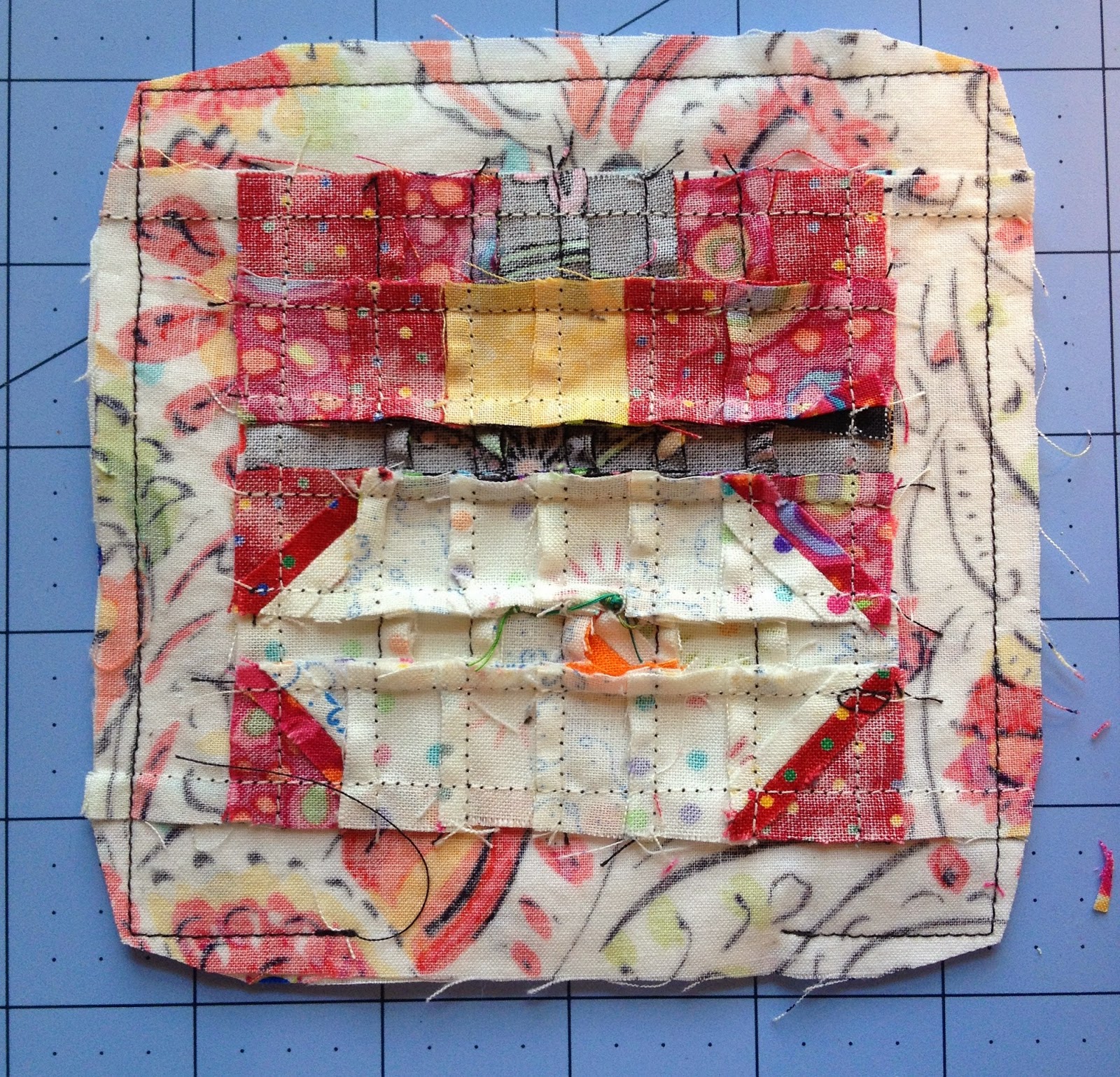 lay 4 red and the 1 orange onto these white squares with right sides together.